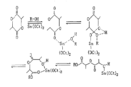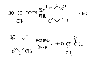 聚丙交酯又称聚乳酸,是一种热塑性聚合物,它在湿气中无光照条件下即可发生水解,在微生物和酶作用下进一步分解为CO2和H2O,是一种环境友好材料。也是目前可生物降解热熔胶中研究多的一种材料。聚丙交酯的原料为乳酸(二羟基丙酸)。乳酸分子结构式中同时含有羟基和羧基,反应活性较高,适当条件下可脱水形成PLA,PLA的合成主要有直接缩聚和丙交酯开环聚合两种方式,开环聚合工艺为:
